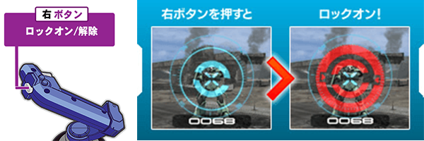 赤色のロックオン状態では常に敵を画面中央に捕らえ続け、攻撃が当たりやすくなります。