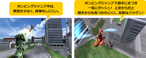 格闘型は、ダッシュ距離が短く、敵に近づきにくい、という弱点があるが、ガムシャラにダッシュせず、ポンピングジャンプをうまく使うことで、少ないブーストで長距離移動が可能となり、その弱点を補うことができる。