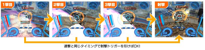 連撃と同じ要領でタイミングよく右(射撃)トリガーを引くことで、格闘攻撃後に射撃攻撃ができる。