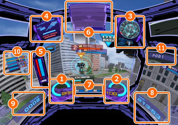 - ⑦残弾表示各武装の残り弾数です。左は左トリガー、中央は両トリガー、右は右トリガーで発射する武装に対応しています。黄色い枠がついている武装が、現在選択されている武装です。